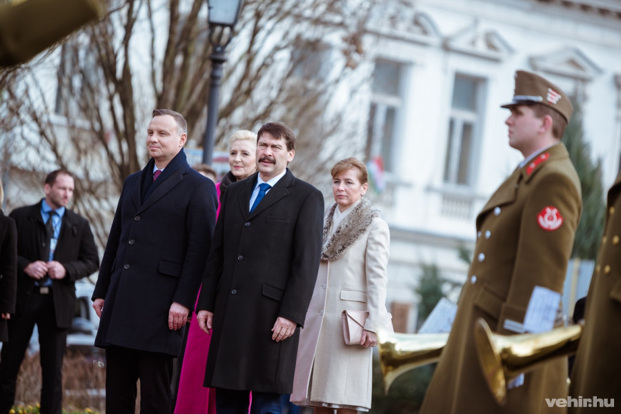 Áder János, Magyarország Köztársasági elnöke valamint felesége, Herczegh Anita délután az Óváros téren fogadták a lengyel államfőt, Andrzej Dudát és a first ladyt, Agata Kornhauser-Duda asszonyt. A két ország államfője katonai tiszteletadás mellett vonult be a város főterére, majd a Dubniczay-palotában kétoldalú tárgyalást folytattak. A tárgyaláson elhangzottakat délután sajtótájékoztatón ismertetik.