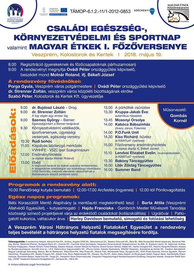 A május 19-i napon drogprevenciós és fogászati előadás, környezetvédelmi vetélkedők, ügyességi versenyek, pónilovagoltatás, rendőrségi kutyás bemutató, kispályás labdarúgó mérkőzés (VVHHFE- VSZC Ipari Szakgimnázium), bábelőadás, bűvészbemutató, musical, táncegyüttesek bemutatója valamint Harley Davidson simogatás is lesz.