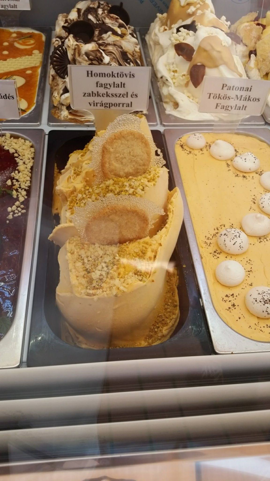 Ez magyar termék, egy váci termelő terméke. Ez 100 százalék homoktövisvelő, semmi hozzáadott anyag nincs benne, aszeptikusan csomagolva, két-három éven keresztül hűtés nélkül eltartható. A virágpor pedig méhész terméke, amivel sokat kísérleteztünk. Ennél két lehetőségünk volt, a szárított és a friss virágpor. A friss virágpor eltarthatósága rövid, ezért az ipar fagyasztja, így ha felenged, megtartja ezt a finom krémes, aromás állagát, ízét. Rá kellett jönnünk, hogy a fagylaltba a szárított nem jó, sem az íze, sem a szilárdsága miatt, mert legurul a fagylaltról.