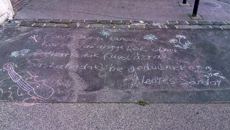 Munkába menet a Szabadság téren, az Óváros vendéglő előtt futottam bele az irodalom és az aszfaltrajz találkozásából született ideiglenes utcafirkába, aminek köszönhetően máris jobb kedvvel vághattam neki a hét utolsó munkanapjának. A járdára ugyanis Weöres Sándor népszerű gyermekversének, a Bóbitának az első sorait írta fel valaki. A Rozé Rizling Jazz Napok helyszínétől néhány lépésre az idézet különösen hangulatossá válik.