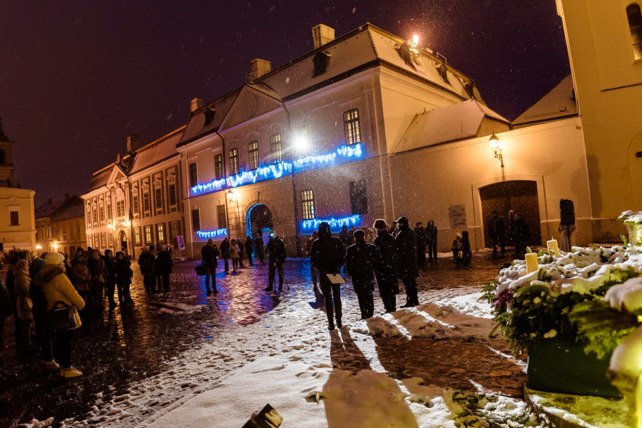 Szállingózó hóban, nagyjából harminc érdeklődő jelenlétében gyújtották meg Veszprém adventi koszorújának utolsó előtti gyertyáját szombat kora este a Szentháromság téren.