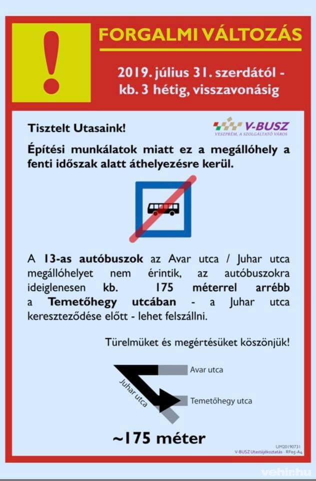 Építési munkálatok miatt az Avar utca / Juhar utca megállóhelyet a 13-mas számú helyi járatok ideiglenesen nem érintik, helyette a Temetőhegy utcában, a Juhar utca kereszteződésénél lehet felszállni a járatokra, körülbelül 175 méterrel távolabb az eredeti megállóhelytől - közölte közösségi oldalán a V-Busz.