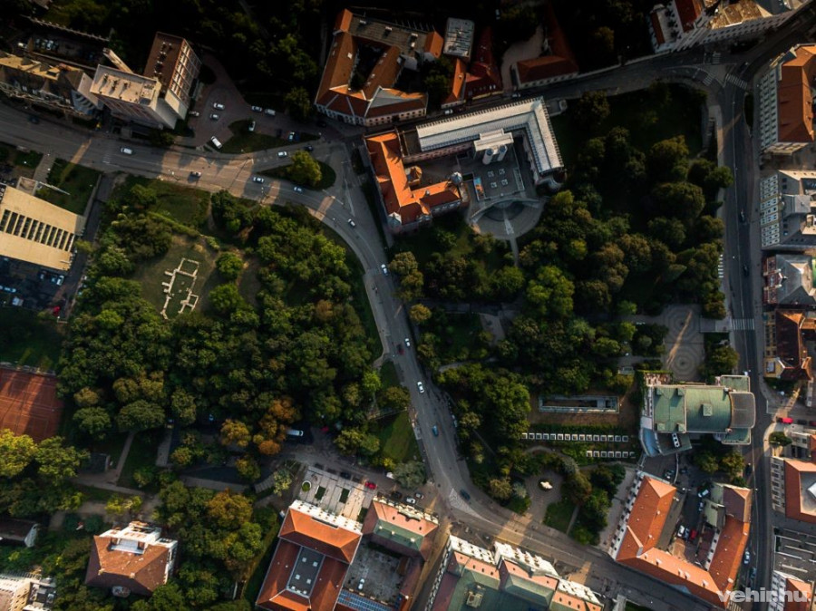 A Színházkert és az Erzsébet-liget zöld fáival vagyunk majdnem egy magasságon.