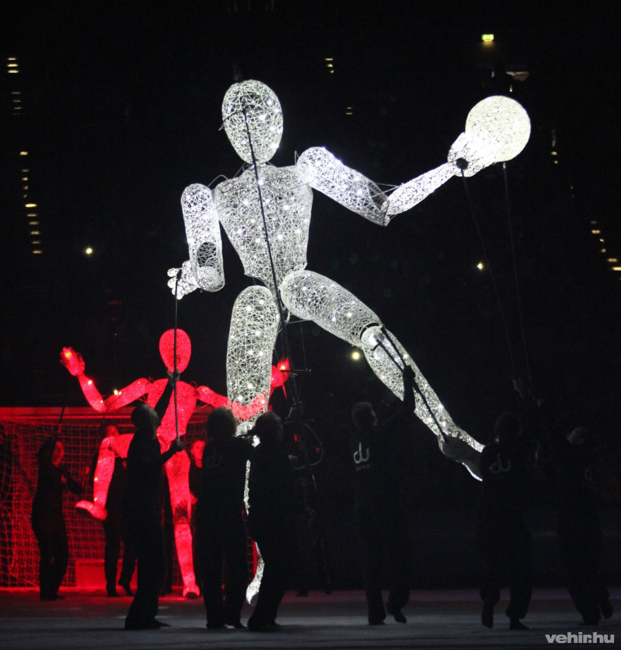 Már a sajtószektorban! Elkezdődött a show! A pálya közepére egy monumentális ledfal ereszkedett le, az égből pedig artisták "potyognak". A Scorpions együttes Rock You like a hurricane című számát adja elő a renkívül csinos énekesnő.
