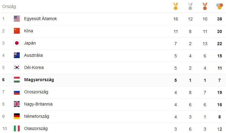 A riói olimpia összesített éremtáblázata a csütörtöki versenynap után: