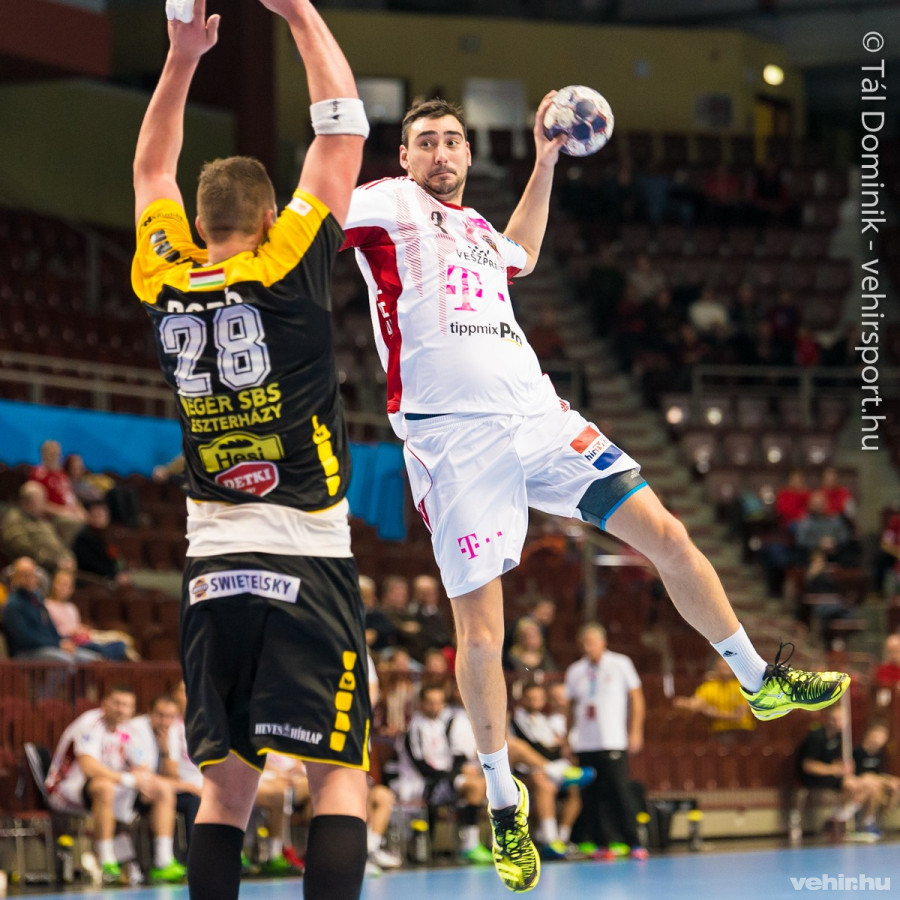 Terzicet küldték ki két percre a sípmesterek, Szabó értékesítette a megítélt büntetőt. Tovább gyorsított játékán a Telekom. Iváncsik és Gajic lerohanásból, Blagotnisek szemet gyönyörködtető akció révén mattolta Stochlt. Radojevic vette vállára övéit duplájával, de hiába, a Veszprém könnyű gólok sorával növelte fórját. A félidei eredményt Gulyás Péter állította be, aki 1400. gólját jegyezte Veszprém-mezben (18:10).