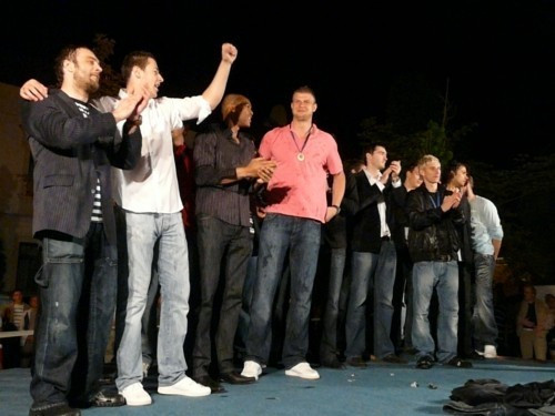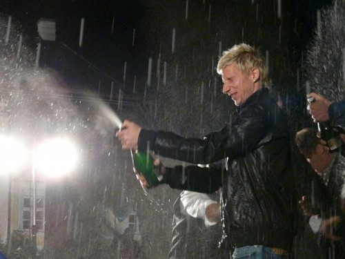 A hazai mérkőzésekről jól ismert „szpíker” Mosonyi József hatalmas ováció közepette egyesével szólította az alkalmi pódiumra a KEK hőseit. A siker kovácsai - játékosok, edzők, orvosok, vezetők - kifejezték örömüket, s megköszönték a veszprémi szurkolók buzdítását. Cozma és Vujin különösen „elemében volt”, a két kiválóság táncra perdült, illetve dalra is fakadt, produkciójuk közönségsiker lett. Az első sorokban állók közös pezsgőzés részesei is lehetettek, az ünnepi nedűt azonban nem a szokványos módon fogyaszthatták el, hanem „égi áldásként” jutottak hozzá néhány játékosok jóvoltából.