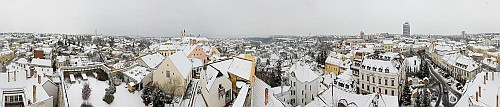 Teljes panorámaképünk a középkori eredetű, a török időket is túlélt, 48 méter magas torony erkélyén készült.