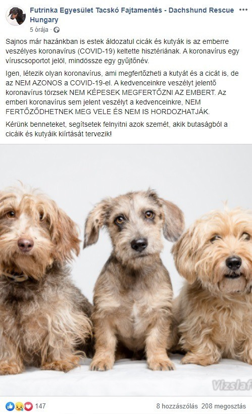 Egy magyar fajtamentő egyesület tette közzé a közösségi oldalán azt a posztot, ami arra hívja fel a gazdák figyelmét, illetve emlékezteti őket, hogy a COVID-19 koronavírust állatok nem tudják elkapni és hordozni sem, ennek következtében az embernek sem tudják átadni.