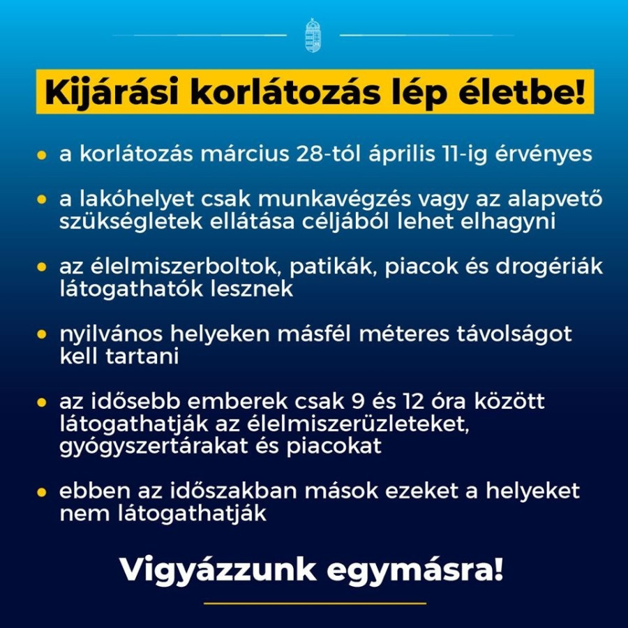 Kijárási korlátozást vezetnek be Magyarország egész területére március 28. és április 11. között. Két héten keresztül az otthonokat, a lakóhelyeket csak munkavégzés vagy az alapvető szükségletek ellátása céljából lehet elhagyni - jelentette be Orbán Viktor miniszterelnök pénteken a Kossuth rádió Jó reggelt, Magyarország! című műsorában.