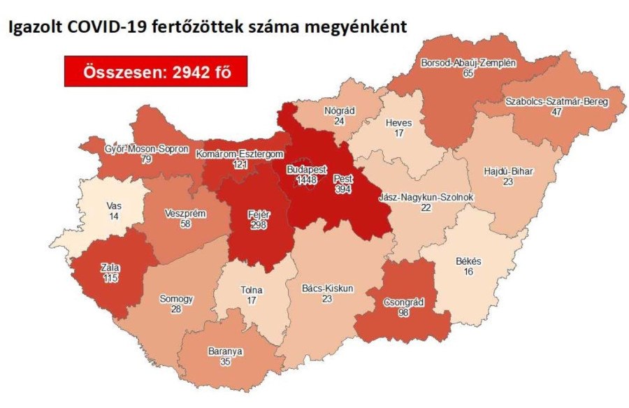 Pénteken ismét 79 új fertőzöttet regisztráltak az országban, ezzel összesen 2942 főre nőtt az igazolt koronavírusos betegek száma itthon, de a tünetek hiánya miatt ennél több fertőzött lehet itthon - írja a koronavirus.gov.hu.