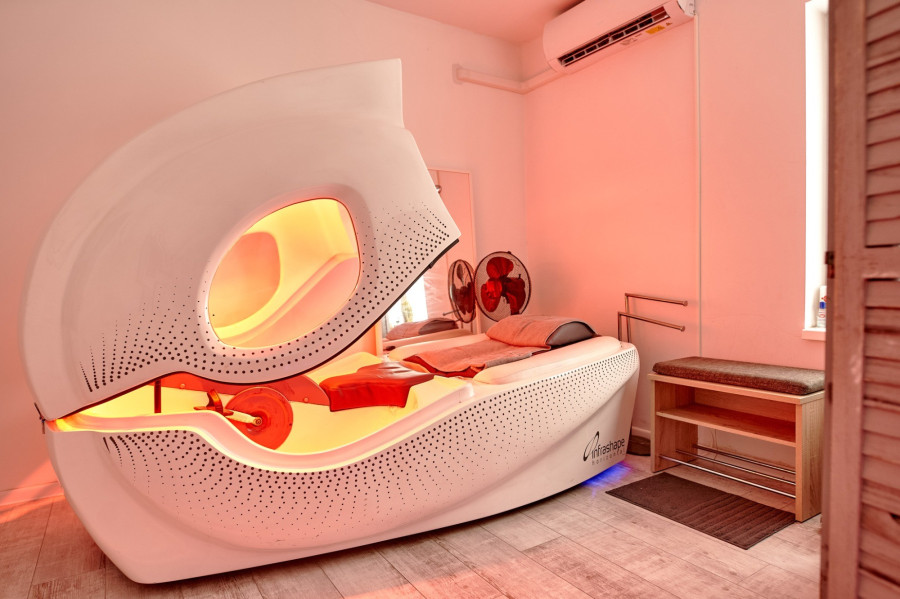 De pontosan milyen gépről is beszélünk ilyenkor? A Body Shape veszprémi stúdiójában az edzéshez egy Infrashape Horizontal gépet használhatunk – tulajdonképpen egy fekvőkerékpárt, ahol hastól lefele egy zárt kapszulában tekerhetünk. Ezen belül akár 50 fokosra is felfűthető a levegő, így olyan, mintha egy szaunában végeznénk kardio edzést, míg a tekerést a vákuum nehezíti. Az élményt emellett kollagén-aroma és fényterápia egészíti ki, ami amellett, hogy feszesíti a bőrt, illetve hatásos módszer a striák, cellulit kezelésére, kiválóan relaxál.