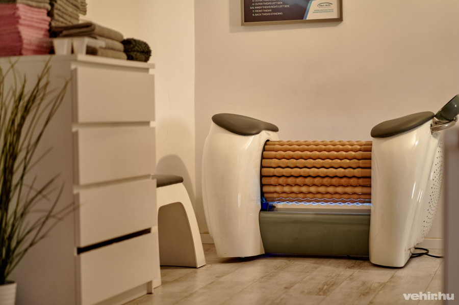 Emellett egy nyirokmasszírozó, zsírtörő, infra és fényterápiával, levegő ionizációval működő Rollshape gép is található a stúdióban, ami a feszesítés és a narancsbőr eltüntetése mellett a jó közérzet fenntartásában is segít. „Ezt a gépet gyakran használjuk izomláz, izomfájdalmak enyhítésére, edzések, testkezelések előtt és után a vérkeringés fokozására, de akár csak egyszerűen relaxációs céllal is. Gyakorlatilag egy kellemes masszázsról van szó, ami az ülőmunka, a stressz okozta fájdalmak enyhítésére is nagyon jó” – mondja Gabriella.
