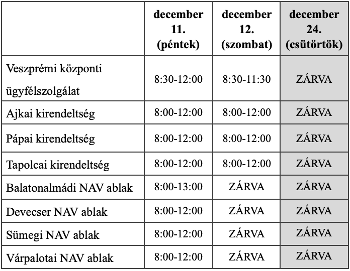 A NAV Veszprém Megyei Adó- és Vámigazgatósága ügyfélszolgálatainak és a kormányablakokban működtetett NAV-ablakoknak ügyfélfogadási rendje a 2020. december 24-i munkaszüneti nap körüli munkarendváltozásra tekintettel az alábbiak szerint változik: