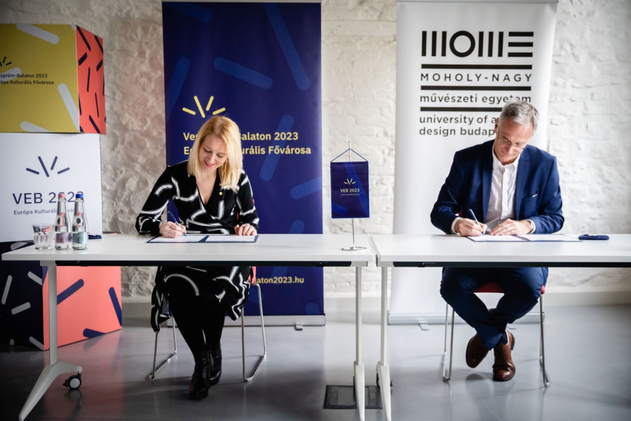 A szerződést Markovits Alíz a Veszprém-Balaton 2023 Zrt. vezérigazgatója és Fülöp József a Moholy-Nagy Művészeti Egyetem rektora írta alá. A nemzetközileg is nagy elismerésnek örvendő megállapodással a mai naptól intézményesült formában is megkezdődik a hosszútávú együttműködés, amellyel jelentős kreatív tudásbázis vonható be az Európa Kulturális programsorozatba.