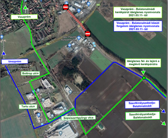 Ezen a szakaszon a gépjárműforgalom két irányban haladhat majd, a mellékelt térképen kék színnel jelölt útvonalon. Az eddigiekben használt, a mellékelt térképen zöld színnel jelölt, Balatonalmádihoz közelebb lévő terelőutat ekkortól már csak a kerékpárosok vehetik igénybe.