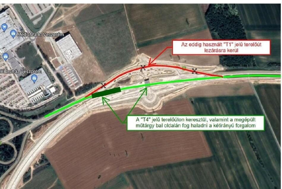 A csomópontot eddig a város irányából elkerülő T1 jelű terelőút lezárásra kerül, a forgalom a megépült műtárgy bal oldalán keresztül haladhat majd kétszer egy sávon és csatlakozik vissza a Budapest út irányába a T4 jelű terelőúton.