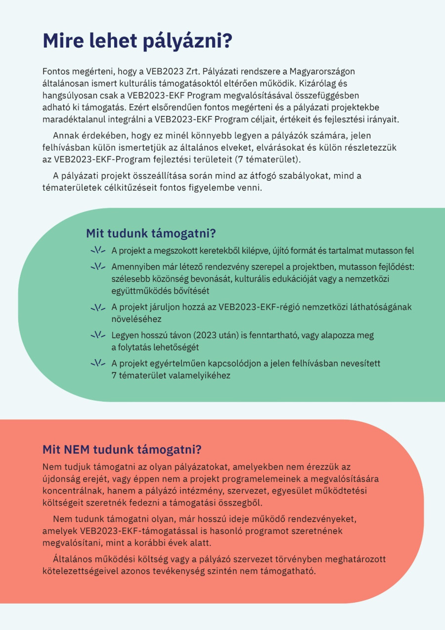 A most közzétett pályázat során olyan programok, események és kulturális célú fejlesztések kaphatnak támogatást, amelyek bevonják a helyi közösségéket, túllépnek az általános kulturális-művészeti célkitűzéseken, ugyanakkor nemzetközi mércével is látványos eredményeket tudnak felmutatni.