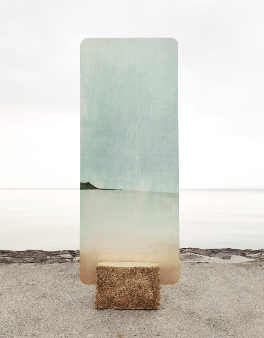 A Balaton témájú festményeimbe mélyedve figyeltem, melyek azok a részletek, amik önmagukban is élnek és kifejezik a tó hangulatát, majd felnagyítottam őket. Az így kapott, immáron önálló festményként viselkedő, impresszionista képrészleteket textilre vittem fel. A megfestett textil, biológiailag lebomló PLA fólia közé került, amely a hőpréselést követően egy lábazatba helyezhető. Az így kapott objektum a célkitűzésnek megfelelően, térelválasztásra alkalmas. A festmény a pamut batiszt anyagnak köszönhetően áttetsző és fényáteresztő, így finoman, észrevétlenül olvad egybe otthonunkkal. A térelválasztóval nem kényszerül keretek közé a látvány, úgy ahogyan maga a kilátás sem. A fenntarthatóság jegyében a lábazat anyaga nád-beton, melyet nádhulladékból állítottam elő.