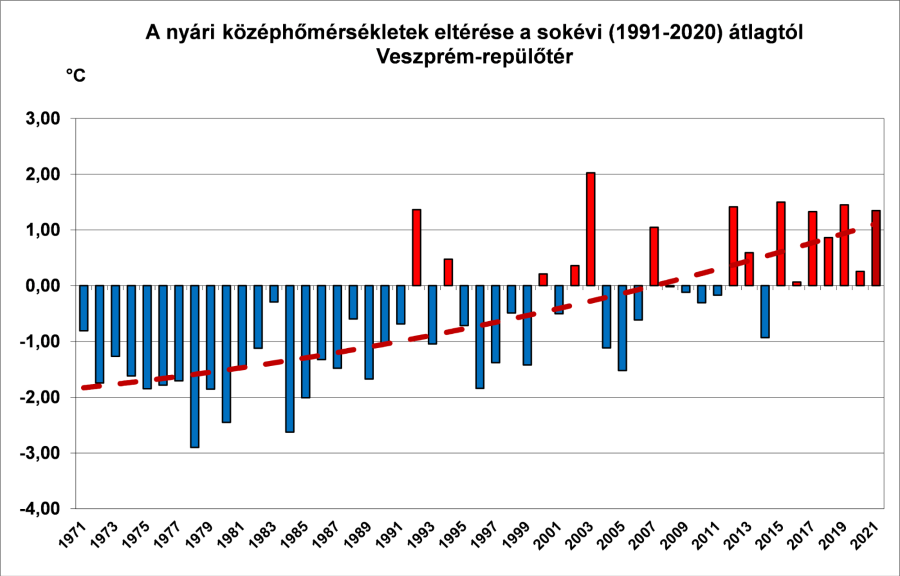 A Veszprém-repülőtéri meteorológiai mérőállomás adatai szerint az évi középhőmérséklet 10,7 C-foknak adódott, ez 0,3 C-fokkal magasabb a sokévi átlagnál, tizenhatodik az 1971 óta jegyzett adatsorban. Az évi átlagos hőmérséklet elfedi azokat a szélsőségeket és anomáliákat, amelyek a 2021-es évet jellemezték.