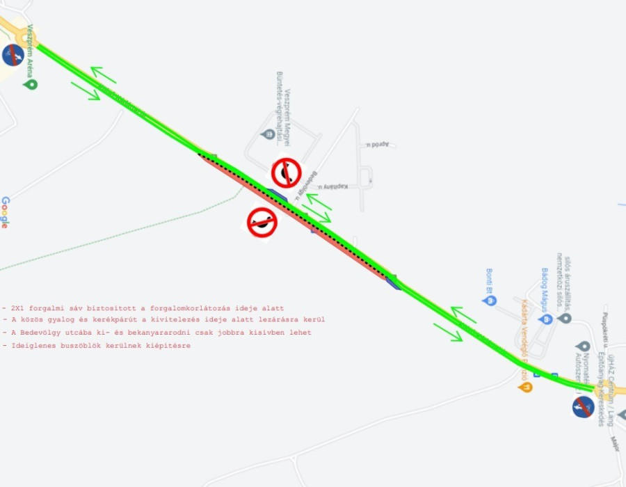 A Bedevölgyi utca irányába a balra nagy ívben fordulás Veszprém felől tiltva lesz, a Bedevölgyi utcába Veszprém irányából az ún. kádártai körforgalomból visszafordulva Veszprém irányába a 82. sz. főútról jobbra kis ívben lehet befordulni. A zavartalan buszforgalom biztosítására ideiglenes buszperonokat építenek.