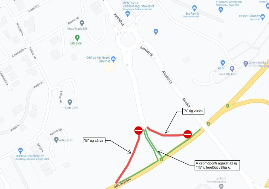 2022 tavaszán, április 20-tól a 8. sz. főút új pályájának kialakítása és az elkészült csomóponti ágak kapcsolatának kialakításának érdekében az átadott Almádi csomópont Veszprém felőli oldalának le- és felhajtó ágait ideiglenesen lezárták. A közúti forgalom biztosítása érdekében ideiglenes terelő utat (T5 jelű terelőút) alakítottak ki. A terelés várható befejezése 2022. június vége.