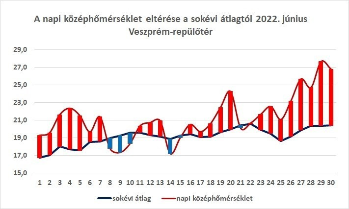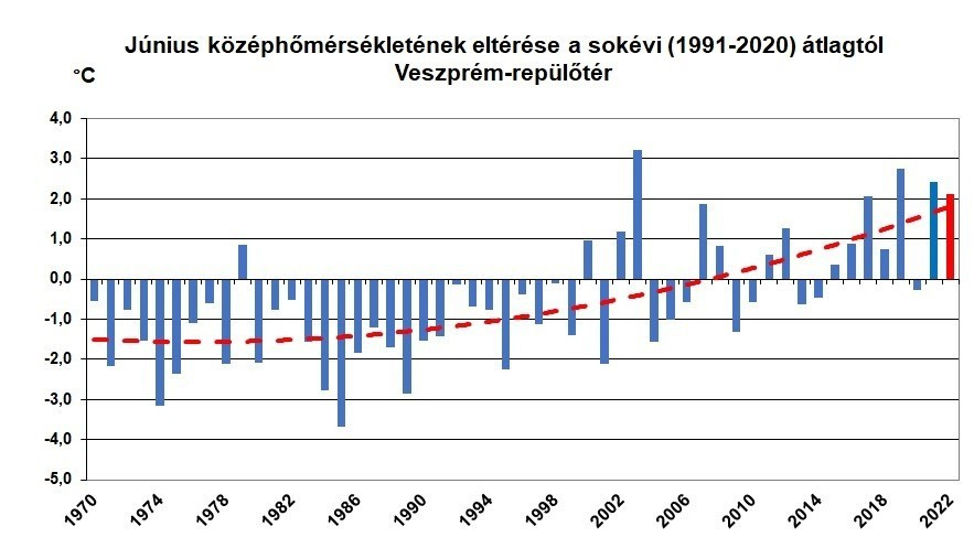 2022. június középhőmérséklete a Veszprém-repülőtéri mérések alapján 21,3 C-foknak adódott, ez 2,1 C-fokkal magasabb a sokévi átlagnál. (Sokévi átlag: az 1991 – 2020 közötti 30 év átlaga.) Az 1970 óta jegyzett adatsorban a negyedik legmelegebb június volt az idei. A sort a 2003-as június vezeti 22,4 C-fokos középértékkel, második helyezett a 2019-es 21,9 C-fokos középértékkel, míg harmadik a tavalyi június 21,6 C-fokos értékkel. A mellékelt ábrán szemléletesen látszik a globális éghajlatváltozás hatása, az egyre melegedő nyári hónapok sorából a június sem lóg ki, míg 2000 előtt egy átlag feletti júniust jegyeztünk fel (1979-ben), 2000 után 14 évben haladta meg a június a sokévi átlagot.