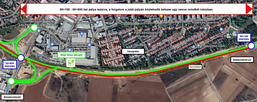 A 8. sz. főút 49+100 és 50+600-as km szelvényei között lezárásra kerül a bal pálya, a forgalom már az elkészült jobb pályán fog haladni ezen a szakaszon. Az átterelések a 49+100 és 50+600-as km szelvényekben lesznek kialakítva. A Stop Shop bevásárlóközpontnál is megnyílik a behajtási lehetőség a 8. sz. főút irányából a végleges forgalmi rendnek megfelelően. A bevásárlóközpontból a közvetlen kihajtás a 8. sz. főútra megszűnik, a jövőben ezt az Almádi csomóponton keresztül lehet megtenni.