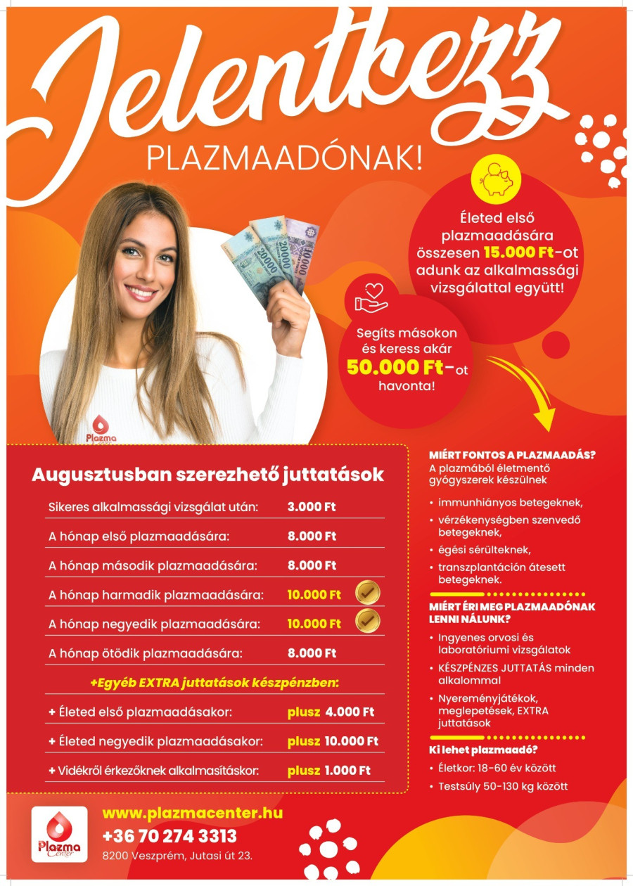 Várják a jelentkezőket akár a www.plazmacenter.hu/idopontfoglalas oldalon, a 06 70 274 3313 -as telefonszámon, vagy pedig személyesen a Jutasi út 23 alatt, hétköznapokon 8:00 és 17:30 között.