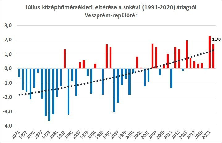 2022 júliusa a Veszprém-repülőtéri meteorológiai állomás adatai alapján a negyedik legmelegebb és a hetedik legszárazabb volt az 1971. óta jegyzett adatsorban. A havi középhőmérséklet 22,8 C-foknak adódott, ez 1,7 C-fokkal magasabb a sokévi átlagnál (sokévi átlag: az 1991-2020 közötti 30 év átlaga), ugyanakkor 0,6 C-fokkal marad el a csúcstartó 2021-es júliustól.