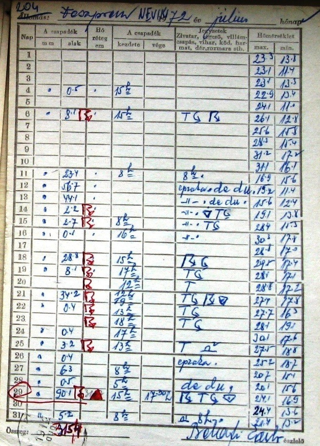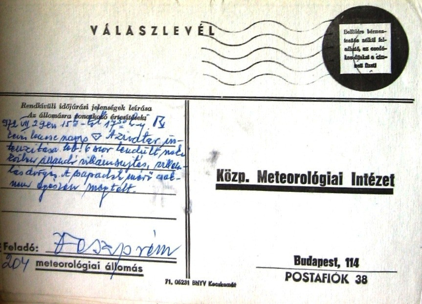 A városi meteorológiai állomás a Nehézvegyipari Kutatóintézet területén volt, Bélafi László észlelő az alábbi jelentést írta a csapadéktáviratra: „’972. VII. 29-én 15 órától 17:30-ig zivatar, benne lencse nagyságú jég. A zivatar intenzitása kb. 6-szor lendült neki, közben állandó villámsúlytás, villámlás, dörgés. A csapadékmérő csaknem egészen megtelt.”