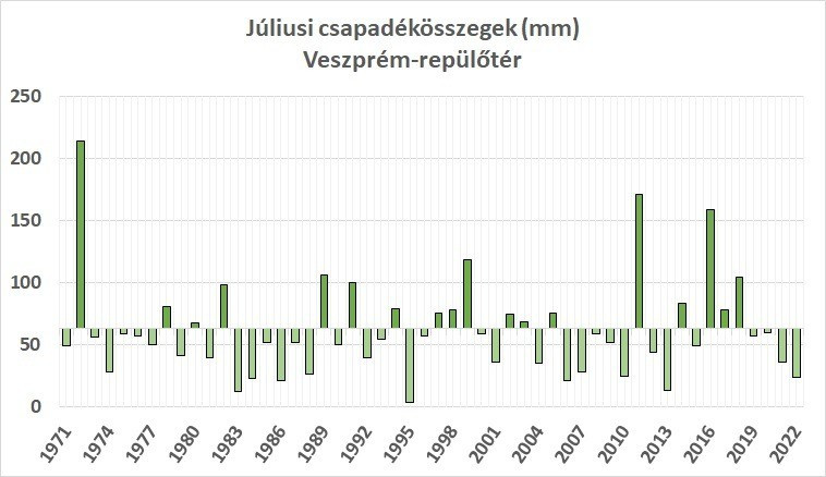 Országos átlagban 2022 első hét hónapja a legszárazabb időszak 1901 óta 206,9 milliméteres átlagos csapadékkal. A repülőtéri mérések alapján Veszprémben 224,9 milliméter esett, ami a sokévi átlag 68 százaléka. Visszatekintve az elmúlt évekre, azt találjuk, hogy az év első hét hónapján lehullott csapadék negatív rekordját 2003. tartja 185,6 milliméteres csapadékösszeggel, a második a sorban 2001. ekkor 187,7 milliméter esett, a harmadik helyezett a tavalyi év, az első hét hónap csapadékösszege 199,2 milliméter volt.