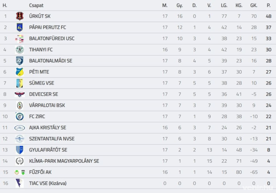 Az elmúlt hétvégén immár tizennyolcadik köréhez érkezett a Veszprém vármegyei I. osztályú labdarúgó-bajnokság. A listavezető Úrkút Zircen újabb sikerrel erősítette meg előnyét a tabella élén, míg a második pozícióban helyezkedő Pápa pontot vesztett otthon, miután az Ajkával 1-1-es döntetlent játszott.