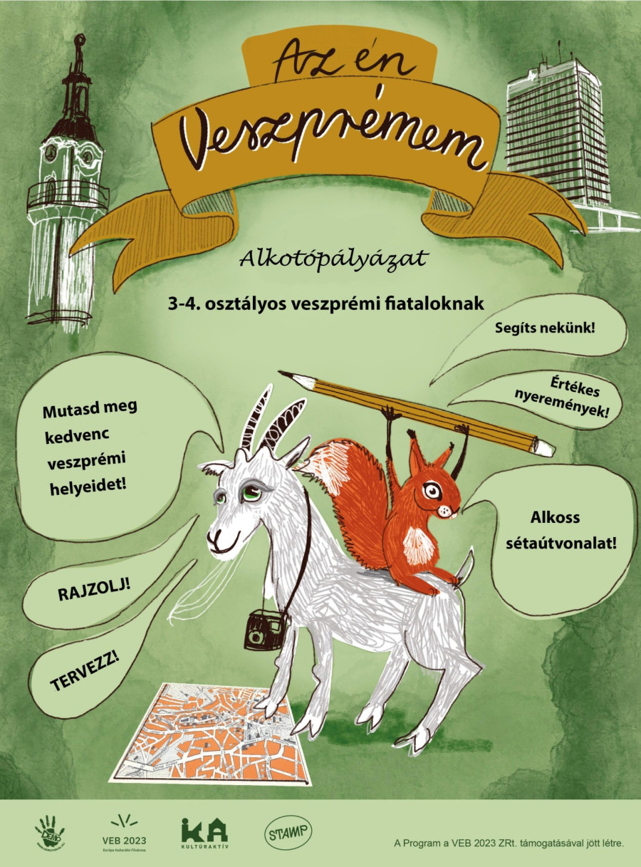 Készíts egy sétaútvonalat nekünk, ahol bemutatod kedvenc helyszíneidet Veszprém városában! Rajzolj nekünk az általad legjobban kedvelt helyszínekről, épületekről, vagy utcákról. Írj a rajzok mellé néhány gondolatot: nevezd meg a helyszíneket, meséld el miért szeretsz ott lenni, kivel szoktál odamenni vagy mitől lenne még szebb az a hely! Elő a színes ceruzákkal, a festékkel, a zsírkrétával! Az elkészült alkotásokat tanárod vagy szüleid segítségével szkenneld be vagy fotózd le és küldd el nekünk a jelentkezési lappal együtt!