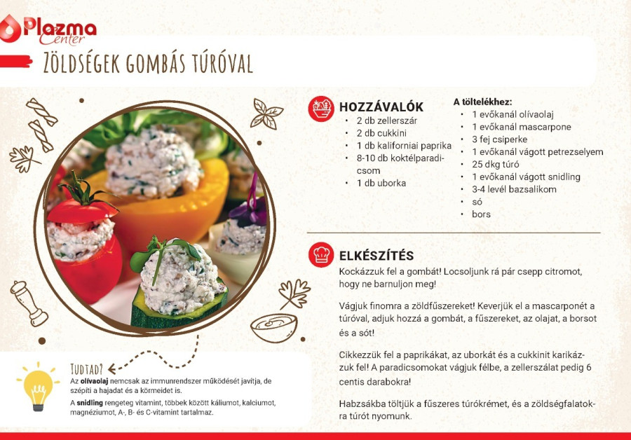 A tudatos egészséges életmód a plazmaadó számára is előnyös, és a levett vérplazma minősége is megfelelő lesz az életmentő gyógyszerek elkészítéséhez. Az alábbi receptötletek természetesen nem kizárólag plazmaadóknak szólnak, hanem bárkinek, aki szeretne jobban odafigyelni arra, mi kerül a tányérjára.