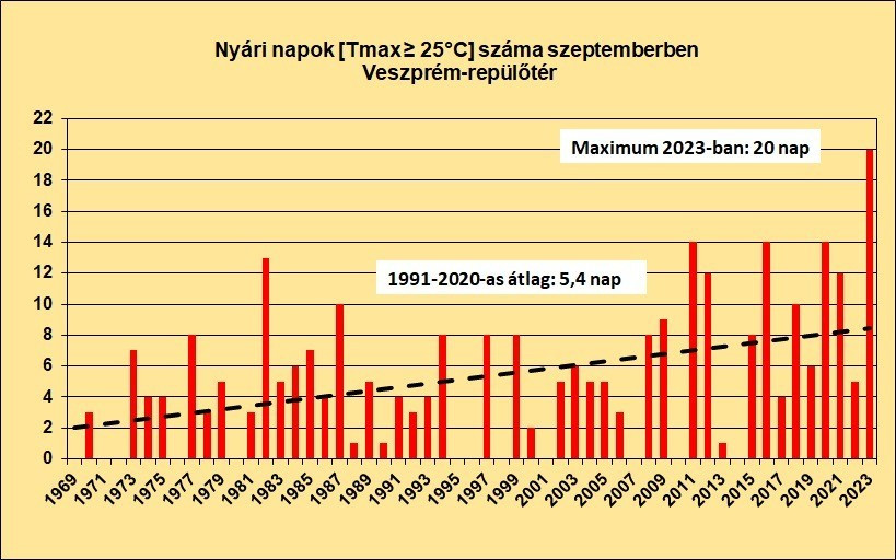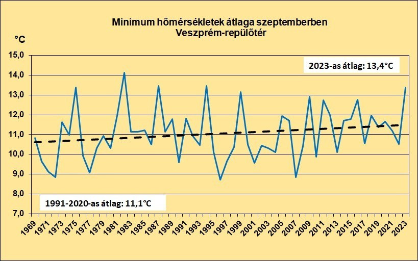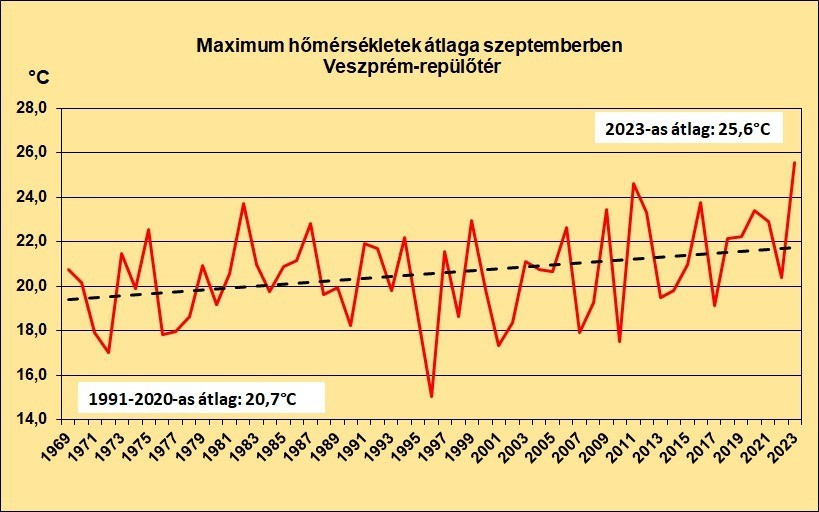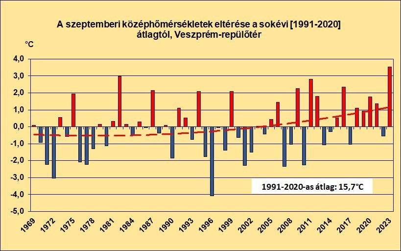 A 2023-as szeptember középhőmérséklete 19,2 C-foknak adódott (az 1991–2020-as átlag 15,7 C-fok). Ez az érték 0,5 C-fokkal meghaladja a korábbi csúcstartó, 1982 szeptemberének hőmérsékletét. A rangsorban a harmadik helyet 2011 szeptembere „érdemelte ki” 2,8 C-fokos pozitív eltéréssel. A három nyári hónap (június: 19,3 C-fok, július: 22,3 C-fok, augusztus: 21,4 C-fok) mellett a szeptember középhőmérséklete is 19 C-fok felett alakult.