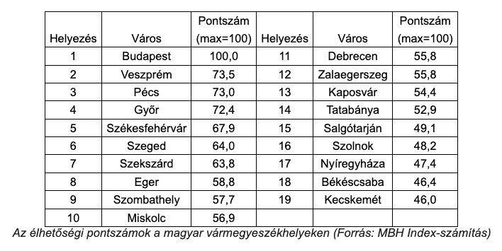 A vidéki vármegyeszékhelyek között tavalyhoz hasonlóan Veszprém az első. A hatodik helyről a másodikra lépett előre Pécs, Győr pedig visszacsúszott a harmadik helyre. Visszaesett a rangsorban a tavalyi harmadik Debrecen, amely idén a 10. helyet szerezte meg, a város szinte minden mutató esetében vesztett pontot. Szeged a korábbi 11. helyről a ötödikre jött fel 2023-ban, miután kiemelkedően javult a bűnözési pontszáma. Szintén sokat javult Eger helyezése, a 2022-es 13. helyett idén a hetedik lett, szintén a csökkenő bűnözésnek köszönhetően. A listát ezúttal is Kecskemét zárja, előtte azonban most Békéscsaba áll, amelyet Nyíregyháza előz meg. Budapest továbbra is jelentősen magasabb pontszámmal rendelkezik, mint a vármegyeszékhelyek.