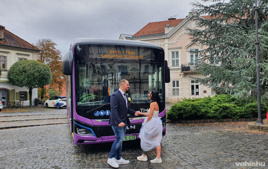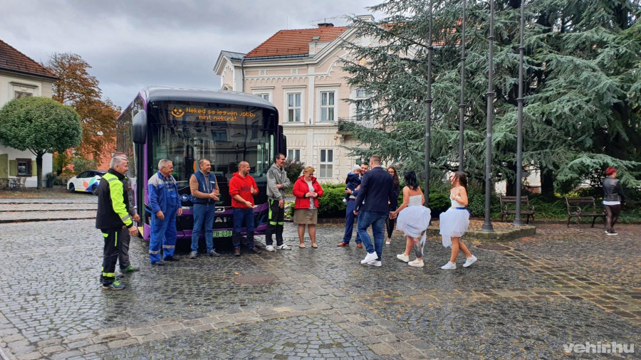 Kicsit később a Zsuzsi-szobor melletti házasságkötő teremből kilépett egy ifjú pár a násznéppel együtt, akiket hangos ovációval köszöntöttek a buszról.