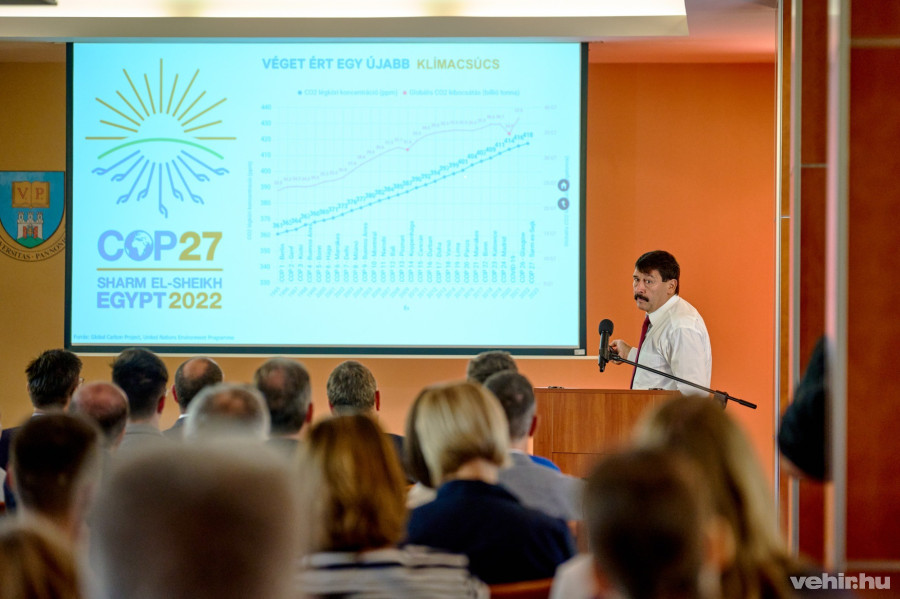 A rektor után Áder János állt a közönség elé. Ő még mielőtt belement volna előadásának részleteibe, egy friss hírrel indított, miszerint a COP28 klímacsúcs előkészítését végző elnökség kiadott egy közleményt, hogy 2030-ra minden országnak meg kell négyszereznie a megújuló energia kitermelési kapacitását. A volt köztársasági elnök szerint ez egyszerűen irreális és teljesen szakmaiatlan, mégis a közönség tapsol az ilyen kijelentéseknek.