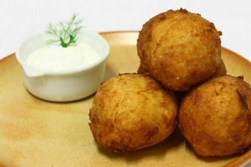 Beolajozott kanál segítségével diónyi fánkokat formázunk és bő olajban aranybarnára sütjük. Fokhagymás tejfellel kínáljuk