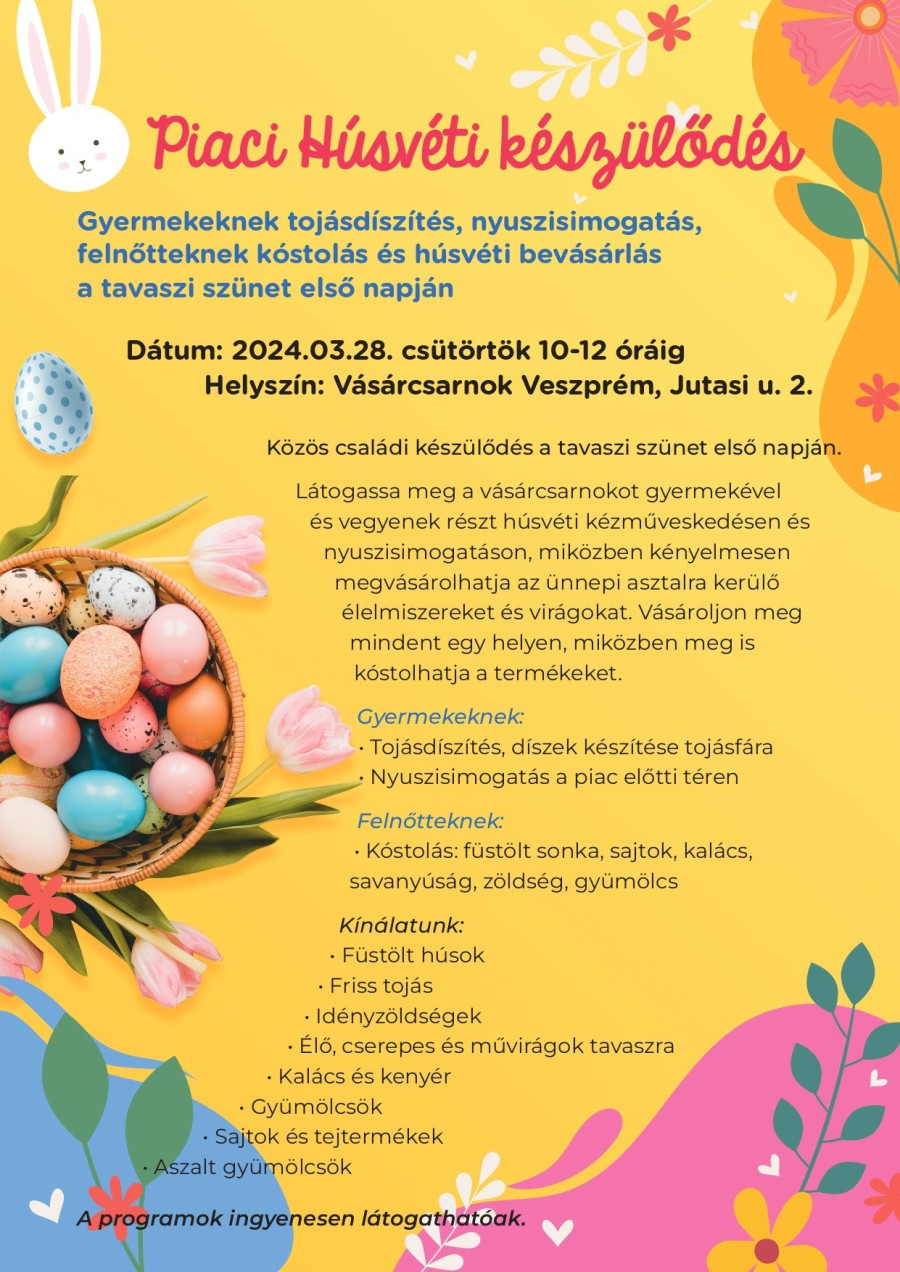 Húsvétváró programot rendeznek március 28-án a vásárcsarnokban! Lesz kóstolás, gyerekeknek kézműveskedés és nyuszisimogatás.