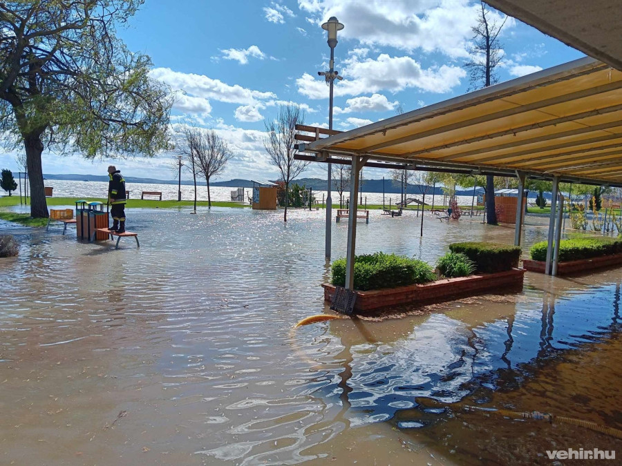 Az erős déli szél miatt a Balaton vize a Tagore sétány üzleteit veszélyeztette. Szivattyúkkal és homokzsákokkal védekeztünk a víz ellen - írta a Balatonfüredi Önkormányzat Tűzoltósága.