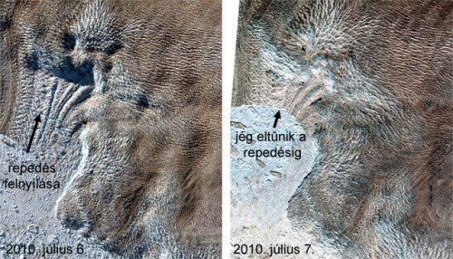 A gleccser peremvidéke július 6-án és 7-én. Jól látható, amint a megrepedt gleccser alsó része eltűnt (anyaga elsodródott a tengervízben, és a helyére benyomult a tenger)