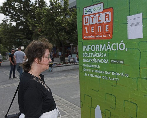 – Nagyon sokan keresnek fel bennünket különböző kérdésekkel, kérésekkel. Eddig kb. 1500 jegyet adtunk el, elsősorban veszprémieknek. Persze jönnek vidékről, és még külföldről is. Ők térképet is kérnek, és gyakran szállást keresnek nálunk – mondta el Merhala Mercédesz, az Utcazene Fesztivál infopontjának egyik munkatársa. – Sokan nem értik, miért lett fizetős a fesztivál. Ilyenkor elmagyarázzuk, idén több színpad lesz – összesen 11 –, és ebből egyért kell fizetni a támogatások elmaradása miatt. Egyébként meg végig kell gondolni, mikor kap az ember 2000 forintért egy Quimby koncertet, és emellett még nyolc másikat. Megiszik valaki öt sört, és ugyanott van.