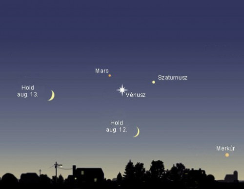 Augusztus 12-én és 13-án este, naplemente után közel fél órával a nyugati égbolt is igen látványos lesz a szürkületben. A legfeltűnőbb égitest ekkor a fényes Vénusz, amely már igen alacsonyan mutatkozik a látóhatár felett. Tőle közvetlen balra a halványabb és enyhén vöröses Mars látszik, míg jobbra felfelé a Szaturnusz figyelhető meg.