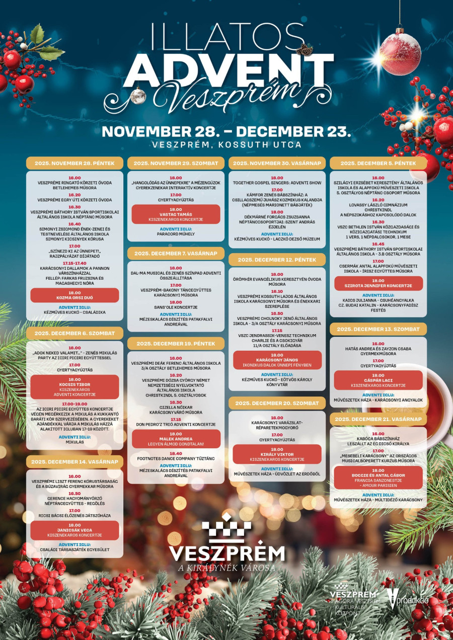 November 28. és december 23. között minden nap szeretettel várunk mindenkit a Kossuth utcára, ahol az Illatos Advent 2025 ünnepi fényei, illatai és ízei teszik varázslatossá az adventi időszakot.