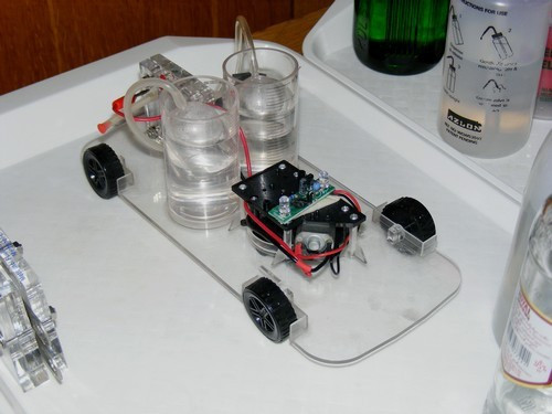 A hidrogén üzemanyagcellának a végterméke víz, nem bocsájt ki környezetszennyező anyagokat - fogalmazta meg az új típusú „motorok” legfontosabb előnyét. Elhangzott, az ELTE kutatócsoportjában megépült egy hidrogén üzemanyagcellás kisautó, ennek részleteivel is megismerkedhettek a diákok. A projektoros vetítésen túl a helyszínen is bemutatásra került, miként üzemel egy kis tüzelőanyagcellás autó, amit kálium-hidroxiddal és metanollal is működésre bírtak, de a vodkával is bírt haladni.