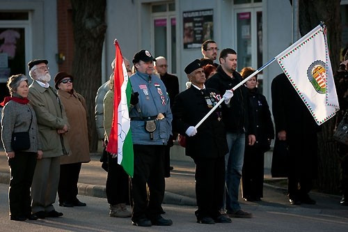 Fodorné Jobbágy Éva, a Veszprémi Örmény Kisebbségi Önkormányzat képviseletében a 12 éve felavatott Kiss Ernő - Lázár Vilmos emléktáblánál méltatta a forradalom hőseit – maroknyi ünneplő társaságában.