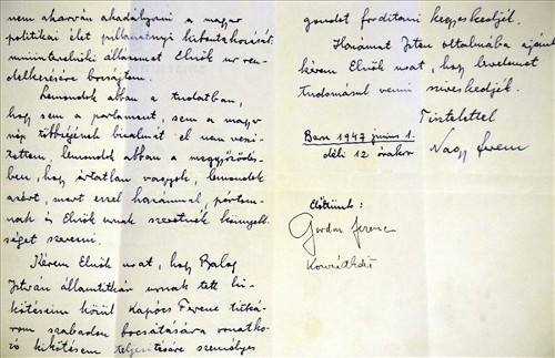 A tájékoztatón szintén részt vevő Ötvös István történész erről azt mondta, az 1947-es év politikai vitáit az erőszak és a zsarolás jellemezte, az év ugyanis nagy koncepciós perekkel kezdődött, májusban pedig már a kormányfő ellen is nyomozás folyt, azzal a nyilvánvalóan hamis váddal, hogy saját kabinetje ellen szervez összeesküvést. A szakértő hangsúlyozta, Dinnyés Lajos kormánya közjogilag törvénytelenül került hatalomra május 31-én, mivel a Svájcban tartózkodó Nagy Ferenc ekkor még nem írta alá Tildy Zoltán államfőnek címzett lemondó nyilatkozatát. Erre csak június 1-jén került sor a svájci határon "maffiafilmekbe illő módon", a magyar kormányfő ugyanis túszul ejtett fiáért cserébe írta meg a dokumentumot egy gépkocsi sárhányóján.