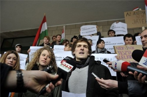 Nem legitim kormány az, amelyik felhatalmazásával visszaélve a hatalom kizárólagos birtoklására törekszik - jelentette ki. Hozzátette: az egyoldalúan megalkotott alaptörvényt nem tartják legitim alkotmánynak, mert "nem az alkotmányosság és az emberi jogok védelmét, hanem a Fidesz-KDNP hatalmi érdekeit, a jogfosztást és a diszkriminációt szolgálja". Hangsúlyozta: Áder János köztársasági elnöktől azt követelik, hogy ne írja alá a jogszabályt. Mellette álló társa, Oláh Kata azt mondta, véleményük szerint nem ők, hanem a kormány követett el jogsértést a demokrácia ellen, mégpedig azzal, hogy "korlátozza minden magyar állampolgár jogait". Kérdésre válaszolva hozzátette, addig fognak tiltakozni, amíg nem valósul meg az alkotmányosság Magyarországon.